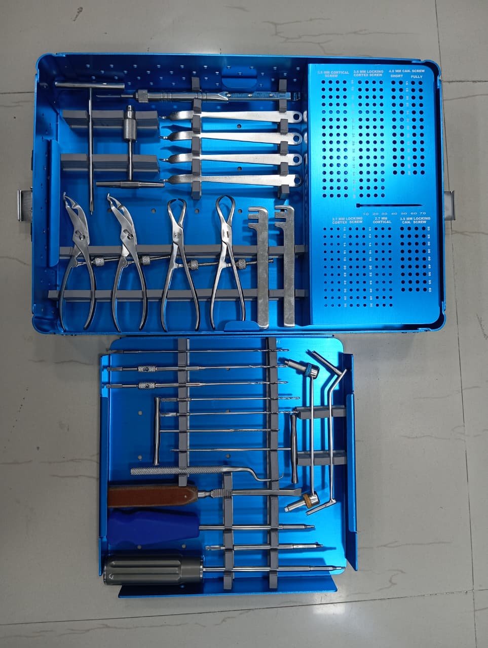 The Small Fragment Instrument Set contains all the specialized tools required for the implantation of small fragment plating systems. It includes drills, taps, screwdrivers, plate benders, and holding forceps designed to ensure precision and efficiency during surgery. Manufactured from high-quality stainless steel, the instruments are reusable, durable, and sterilizable. This set is essential for trauma surgeons performing fixation in small bones such as the hand, wrist, and ankle.